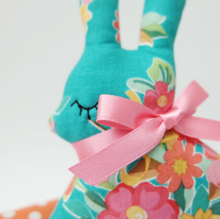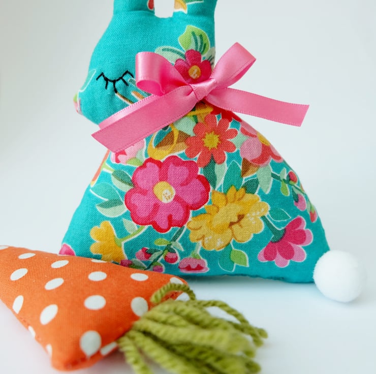 The lavender filled rabbit is made from a bright, gypsy floral cotton fabric in turquoise. The lavender filled carrot is a jolly orange and white spot cotton, with green wool leafy tops. The rabbit has some toy stuffing in it too, for extra shape. Finished with a pretty bright pink satin bow.