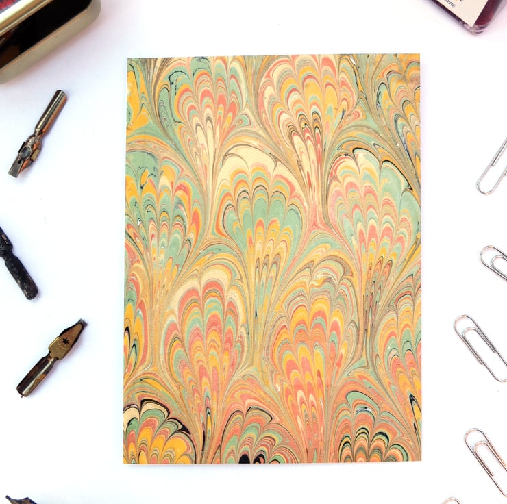 This stunning hand marbled greeting card features a peacock pattern in my favourite colour combination of sage green, mustard yellow, metallic copper, metallic gold and just a hint of black.