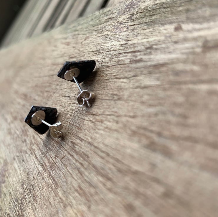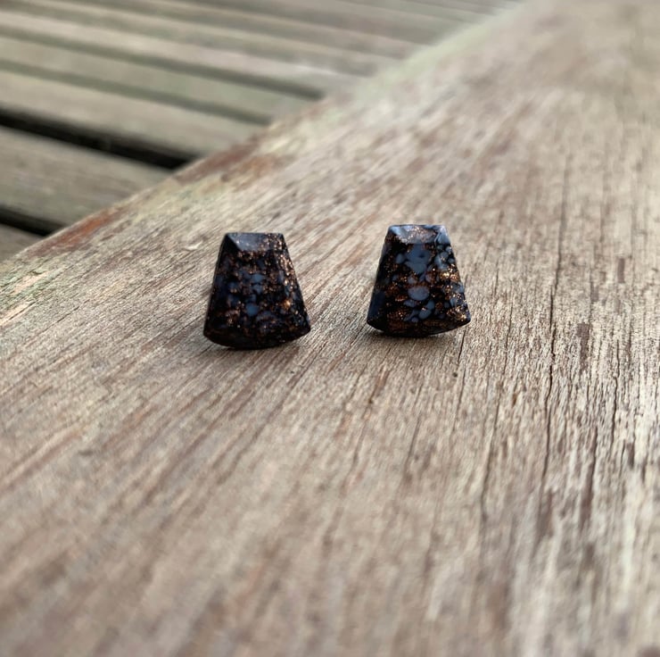 Black glass with white and gold marbling effect on silver plated stud earrings.