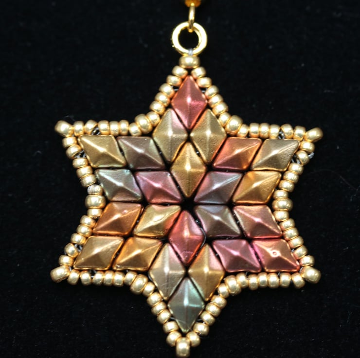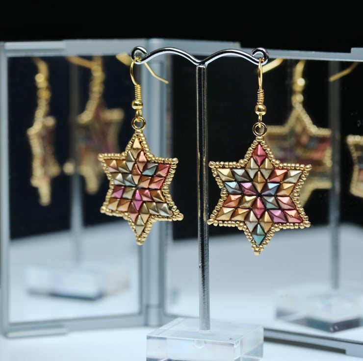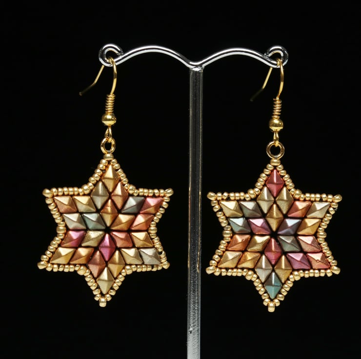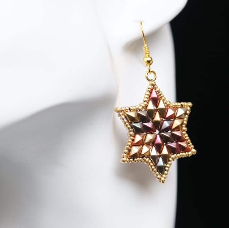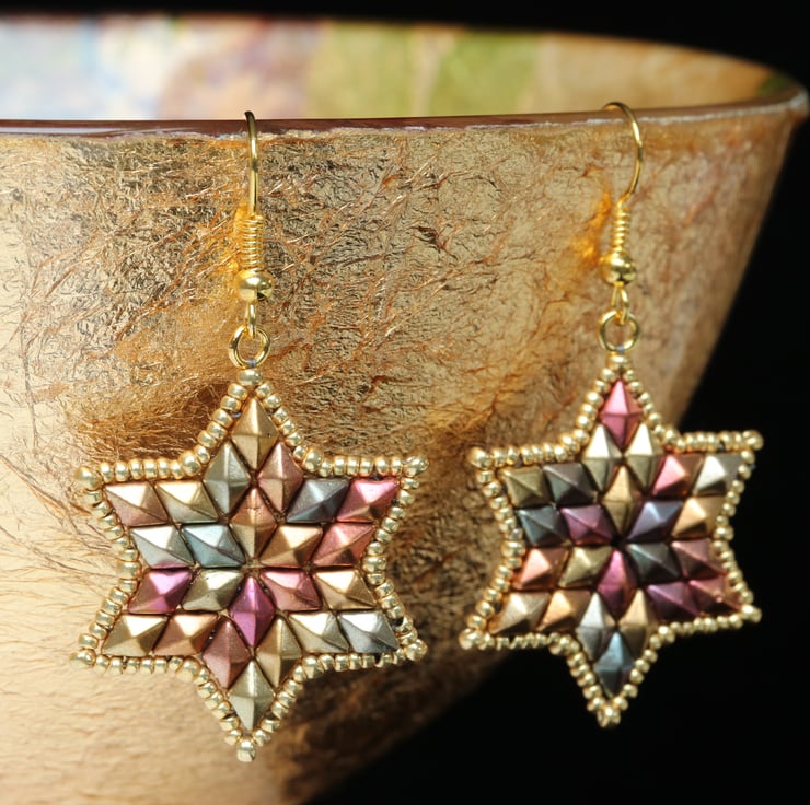 These pretty star shaped earrings are in many colours: copper, red, green, gold, bronze, but the main tones are copper and gold. They are made from diamond shaped beads called mini diamonduos by a process called beadweaving: stitching the beads together. The diamonduo beads are sewn into a pretty star shape, surrounded by tiny gold coloured seed beads.