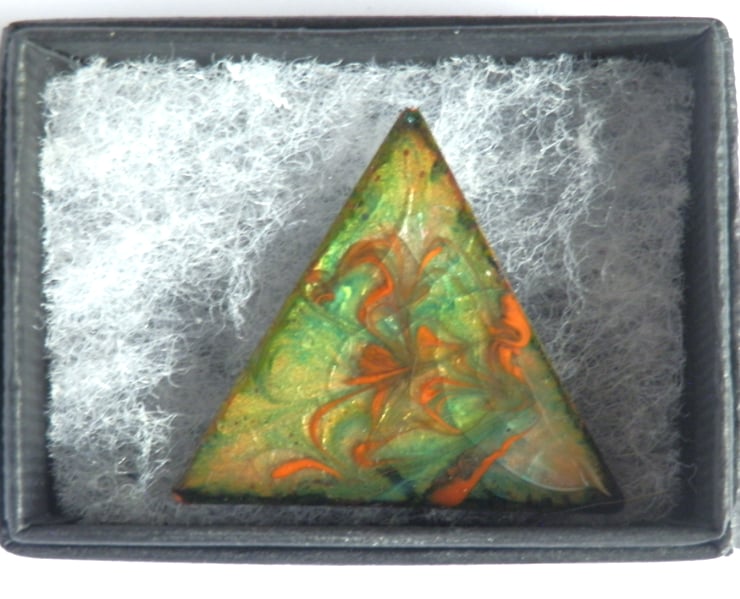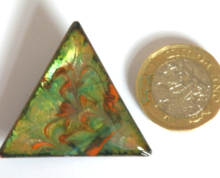 The three sides of the triangle are equal, 37mm. I have soldered a 20mm brooch bar centrally to the reverse of the triangle, allowing the brooch to be worn with the pin vertical or horizontal. The pin fastens with a rotating catch for security.