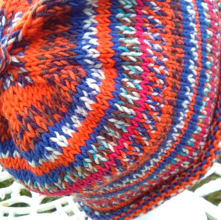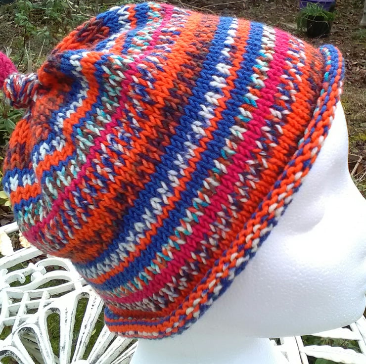 This hat has been hand knitted on the round to show off the self striping jacquard pattern brilliantly. It is a simple roll up design so will sit on or below the ears depending on how you want to wear it. It has a fun knotted top making it a little quirky.