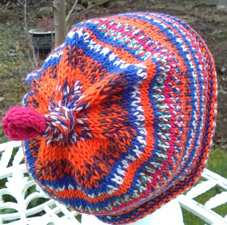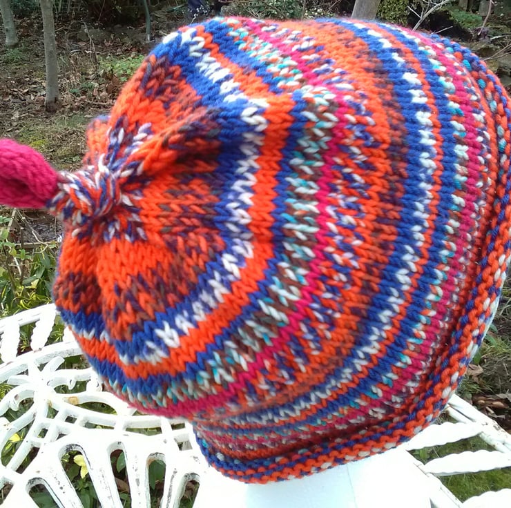 This hat has been hand knitted on the round to show off the self striping jacquard pattern brilliantly. It is a simple roll up design so will sit on or below the ears depending on how you want to wear it. It has a fun knotted top making it a little quirky.