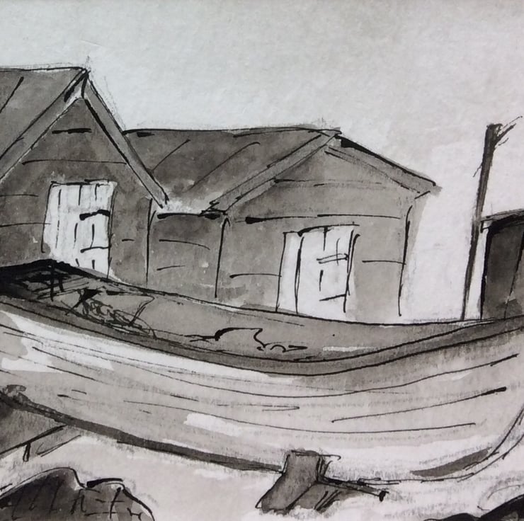 Pen, ink and watercolour miniature of a fishing boat awaiting repair at the harbour.