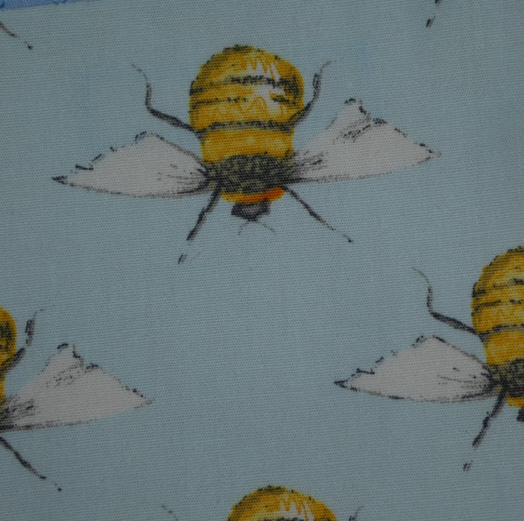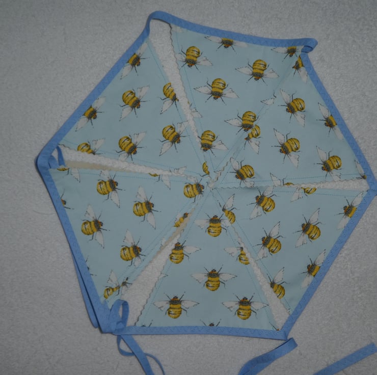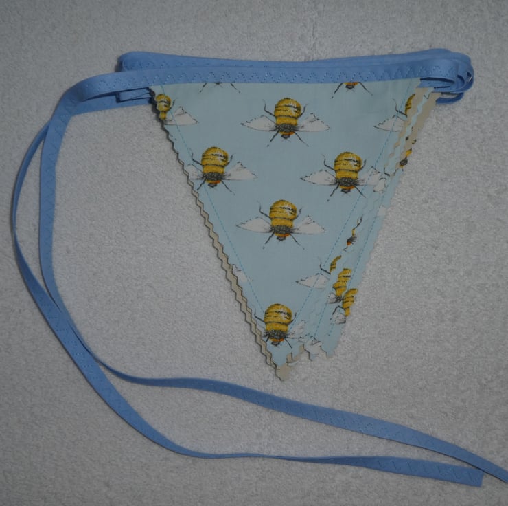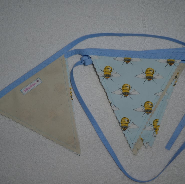 This bunting is made from a lovely bee print poly/cotton fabric. This fantastic bunting would make a great addition to your home. It could be used for summer barbecues, camping trips or to use indoors.