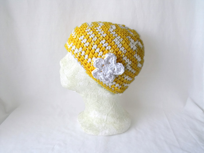 Here we have a yellow and white crocheted cotton hat.