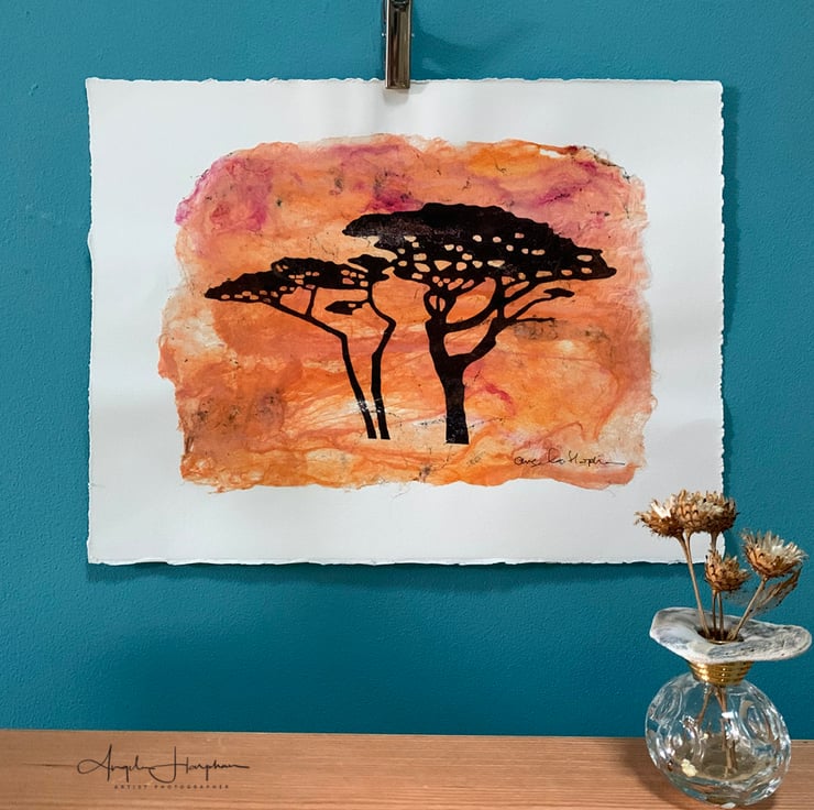 This dramatic piece of art looks like a hot Savannah, but is actually inspired by two trees and sunsets on the Helford Estuary in Cornwall. I like the stark silhouetted trees on the orange background. I keep revisiting these trees that appear in various ways in different pieces of art