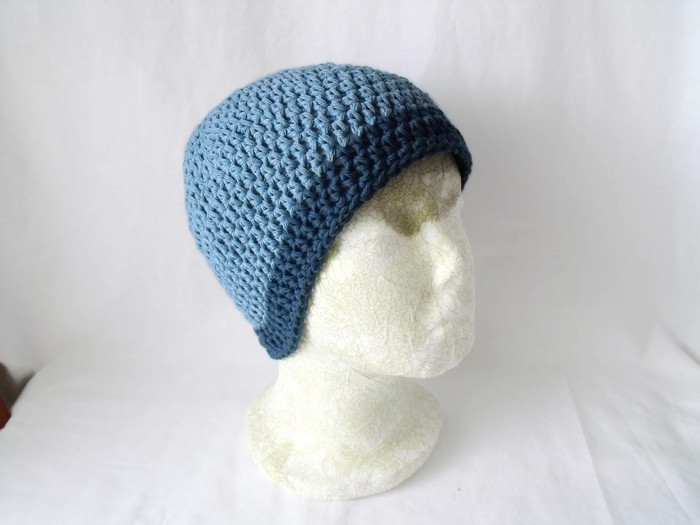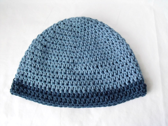 Here we have a denim and navy blue unisex crocheted cotton hat.