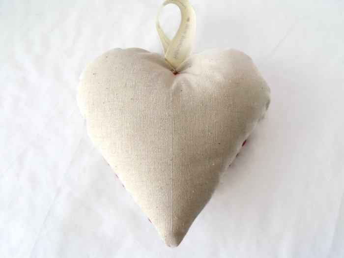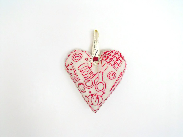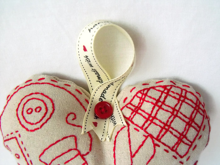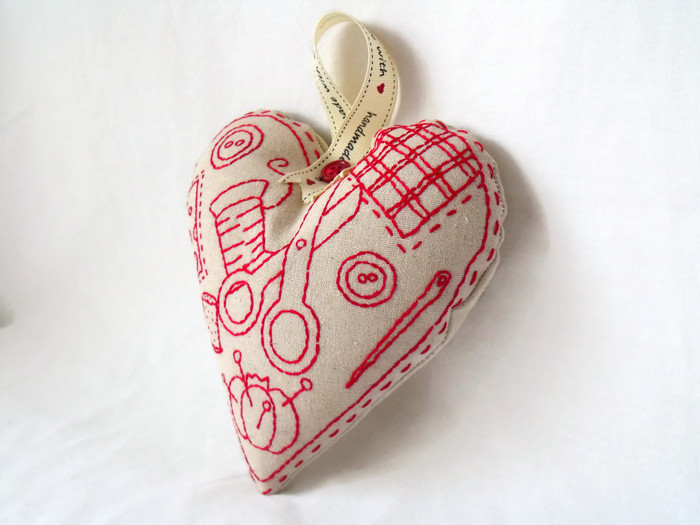 I've used red DMC embroidery thread and stitched sewing related images onto beige linen fabric.