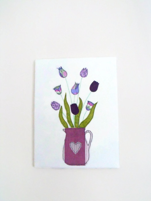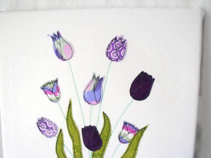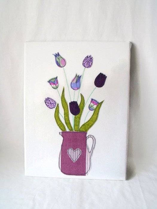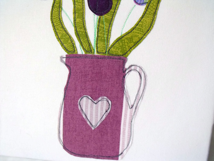 I've cut out tulips and a jug in various shades of purple then machine sewn them onto white fabric.