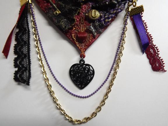 This love you heart has a purple cord hanger and I have added a gold chain and a purple ball chain with ribbon and lace to the sides, there is a filigree black heart charm at the bottom.