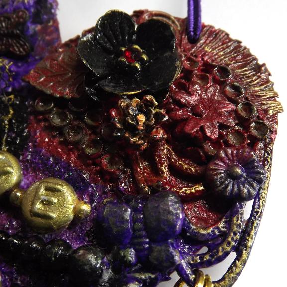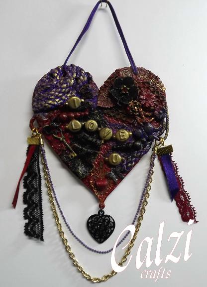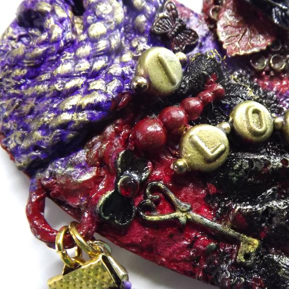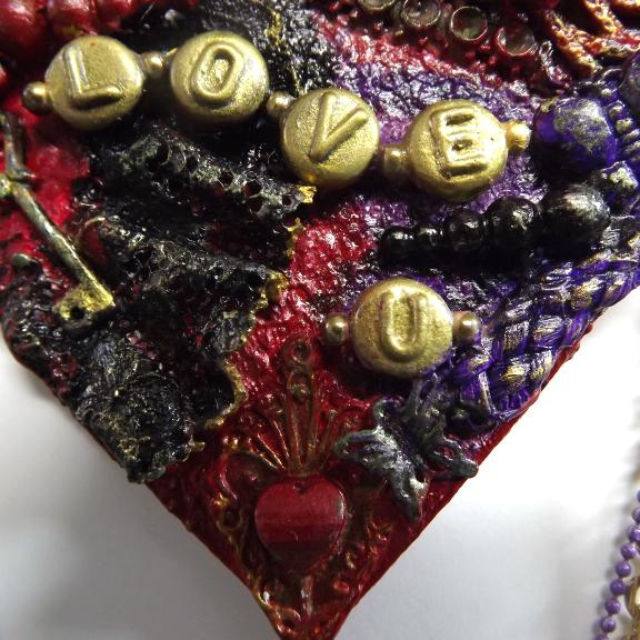 I have decorated this 10cm mdf heart in rich red, black, purple and gold, using lace, papers and various upcycled bits and pieces. The letter beads have been painted and brushed with gilding wax.