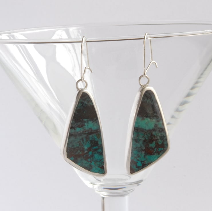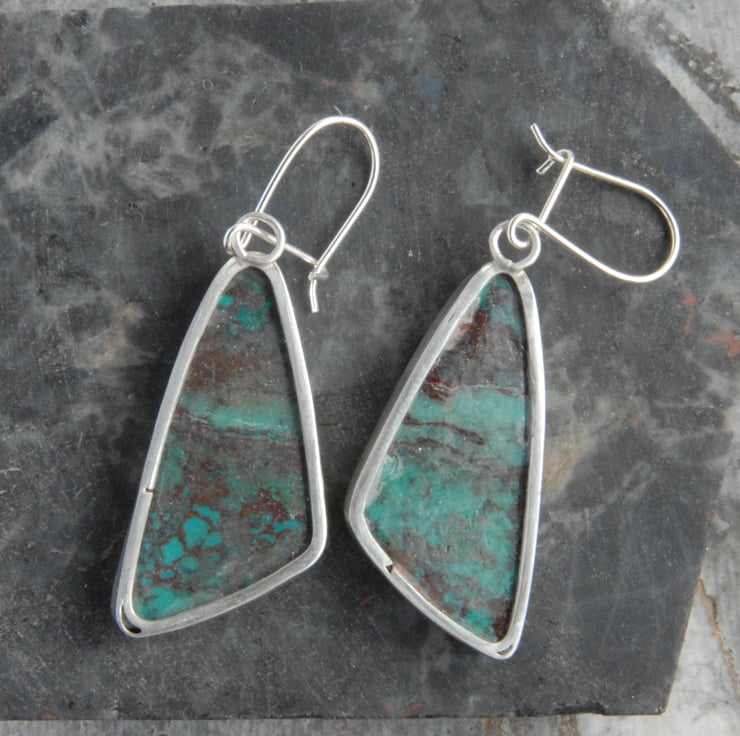 These dangle earrings feature rounded triangular drops of greeny blue chrysocolla which have been bezel set in sterling silver and finished off with sterling silver safety hooks (they have an extra bit that the back of the hook slots into so the hooks can't be knocked out of your ears). The chrysocolla is a mix of bluey greens, teals and deep dark brown, it showed evidence of cracks so I opted to stabilise it with resin rather than risk them breaking - the resin is visible on the back of the stones but not on the front - the stones were too beautiful to not use them and the combination of resin and setting hold them secure so they will last a life time.