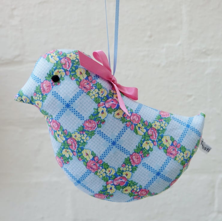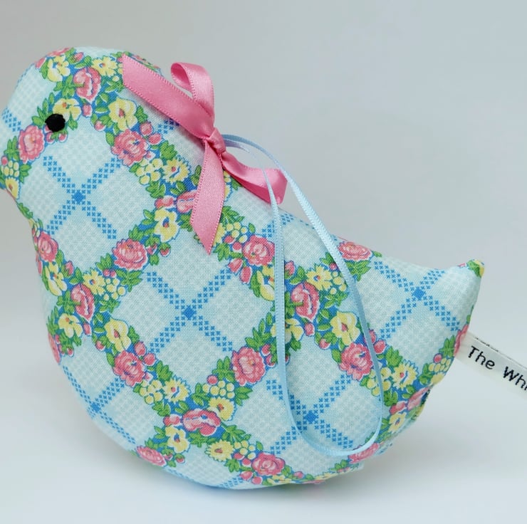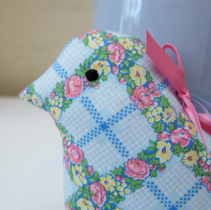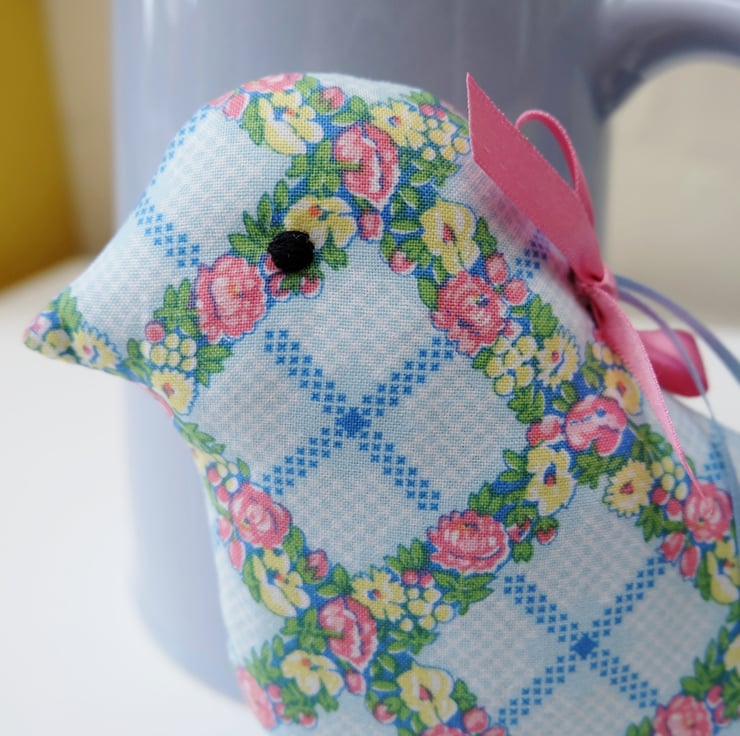 I have used a vintage style, blue trellis floral cotton fabric in a soft shade of blue, with pink and yellow flowers and green foliage. The sachet has a pale blue satin hanging ribbon loop. Filled with lots of lovely lavender grains and polyester stuffing for a firm shape, the scent in the bird lasts a long time; you can squeeze it to reactivate the scent, or add lavender drops later on too.