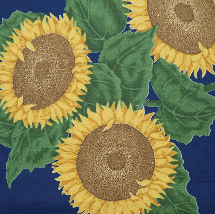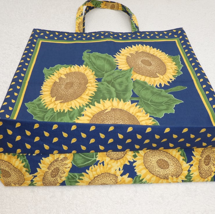 This bag has been made from fabulous sunflower print cotton fabrics. The bag is fully lined, with a plain cotton fabric, and I have stitched an inside pocket to the lining, decorated with ric rac