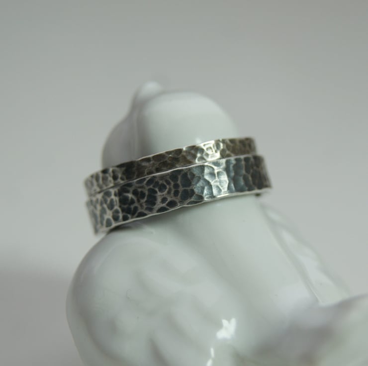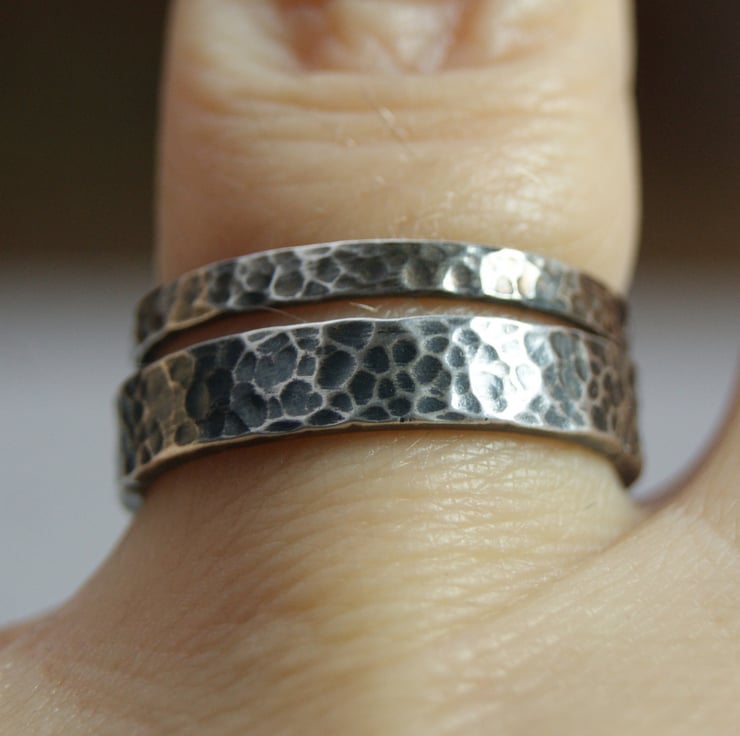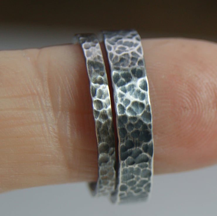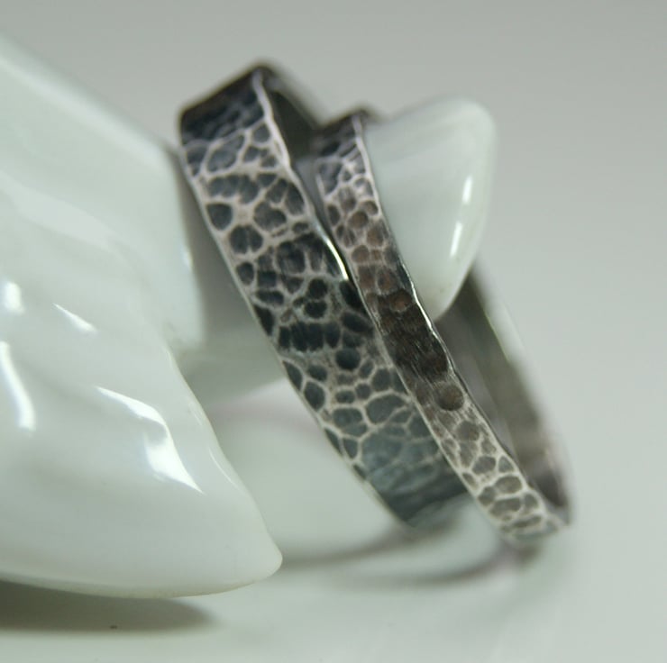 The bands are made of sterling silver and have been hammered for a rustic texture, oxidised and then hand polished.