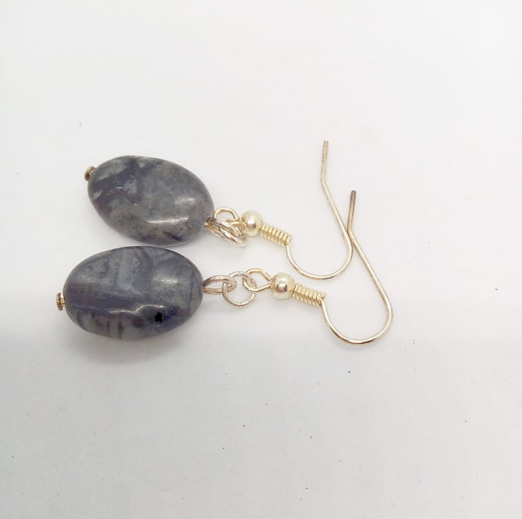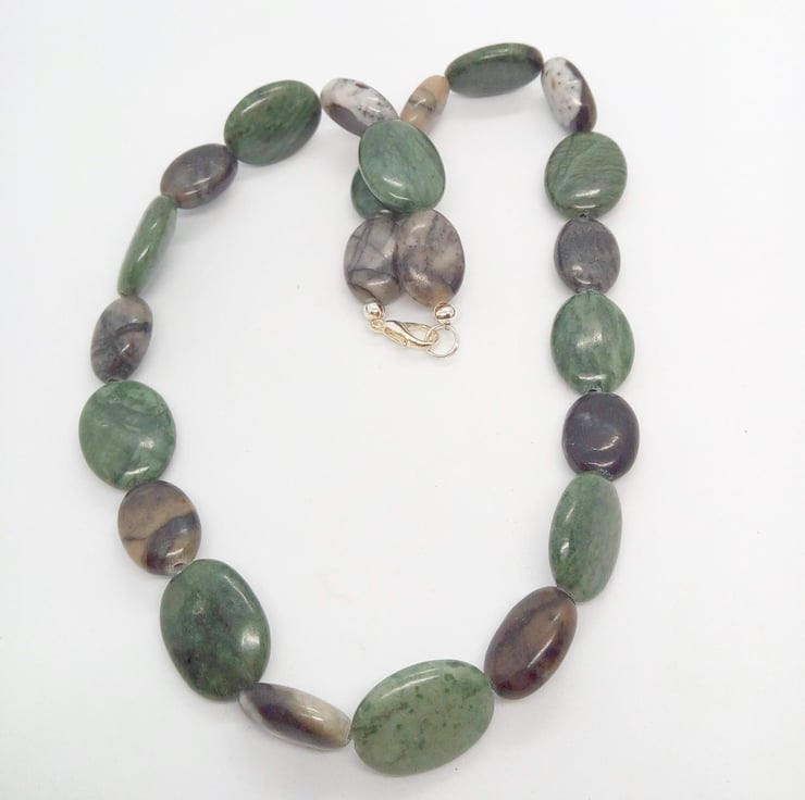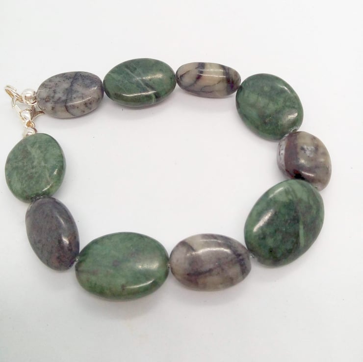 This lovely set is made using green and charcoal grey agate semi precious beads. The earrings have silver plated fish hook ear wires. The Necklace and bracelet both have a silver plated lobster clasp.