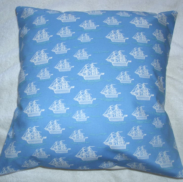 On the Oceans Sailing Ships cushion with tall ships and sailing ships on a blue background.