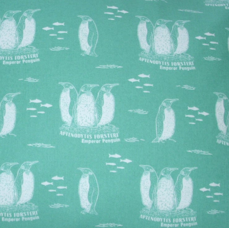On the Oceans Emperor penguins in groups with little fish swimming in between on a pretty green background.