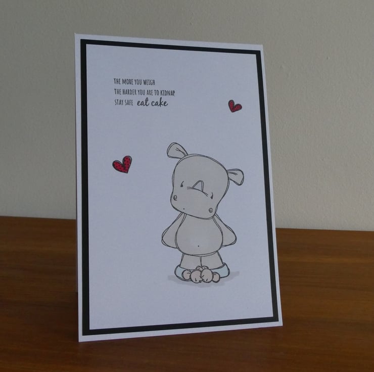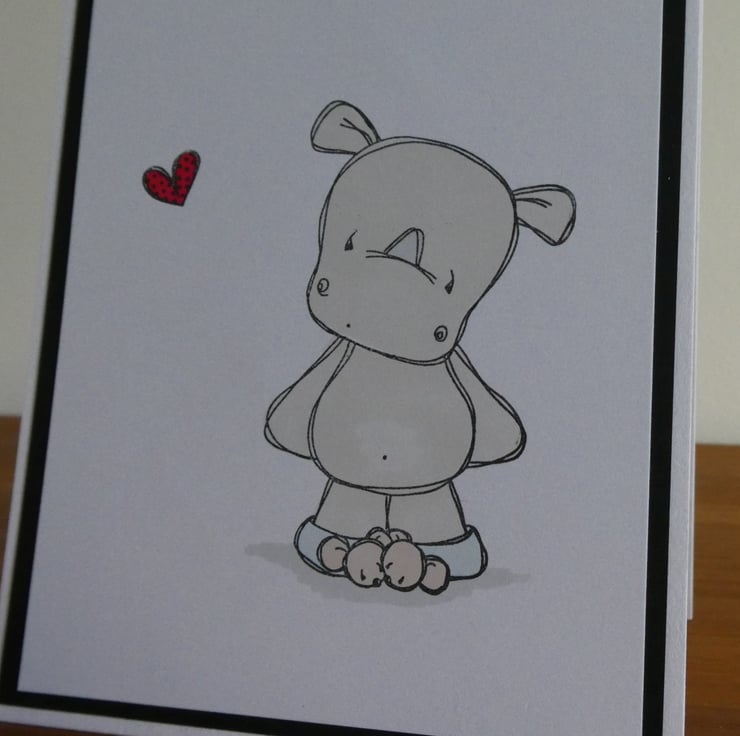 This card has been hand stamped with a cute rhino and coloured in soft pastel greys and blues and finished with bright red hearts.
