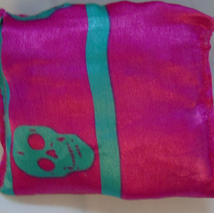 Gorgeous Shopping or Tote bag upcycled from a vintage silk scarf. The bag features a very bright and colourful skull pattern design
