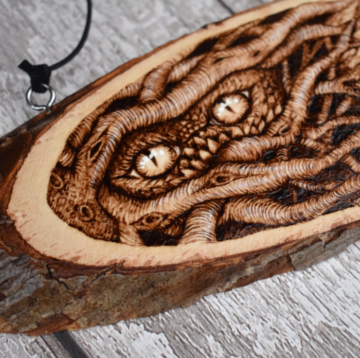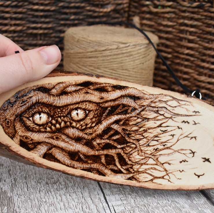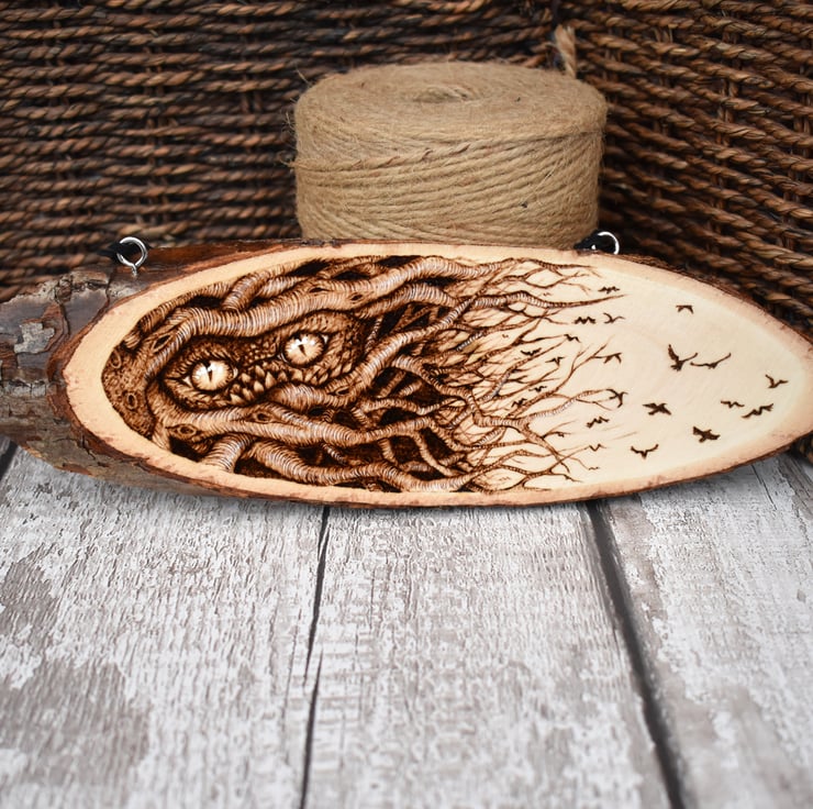 A hanging wood slice plaque decorated using pyrography. An original design created by myself, featuring a tangle of branches, two creature eyes and the branch ends becoming birds in flight.