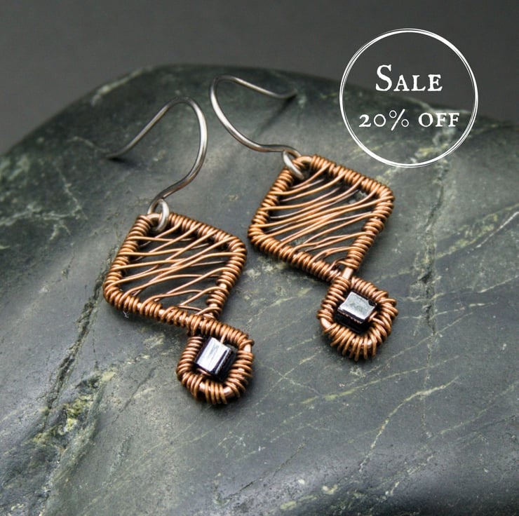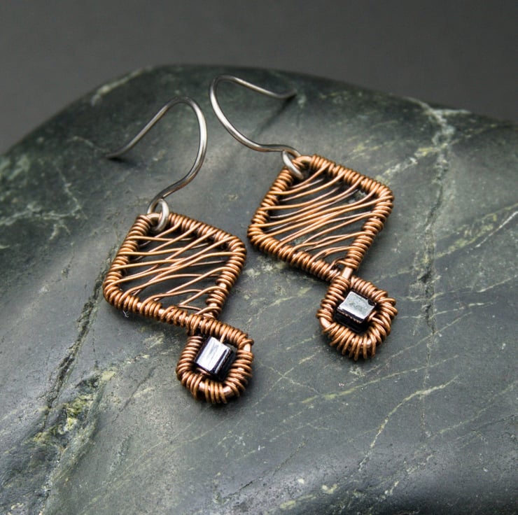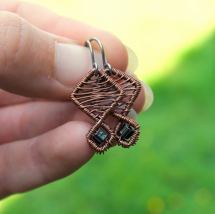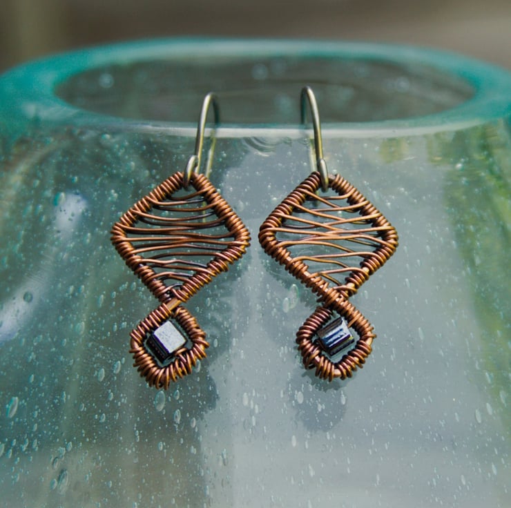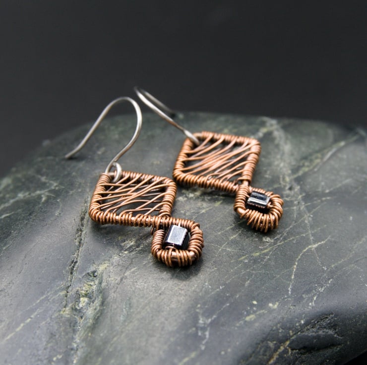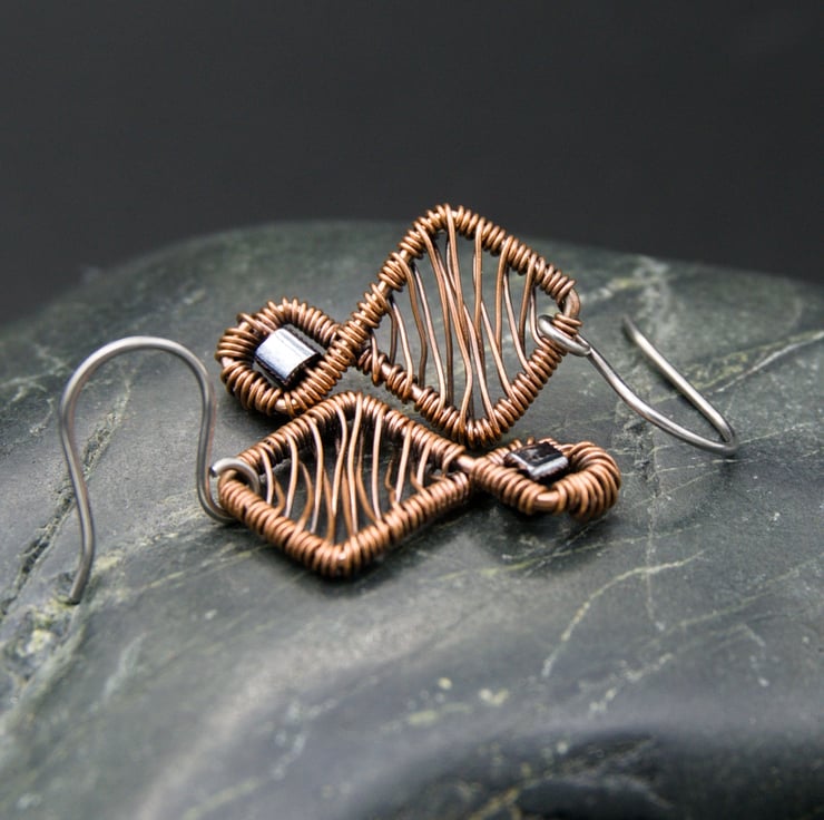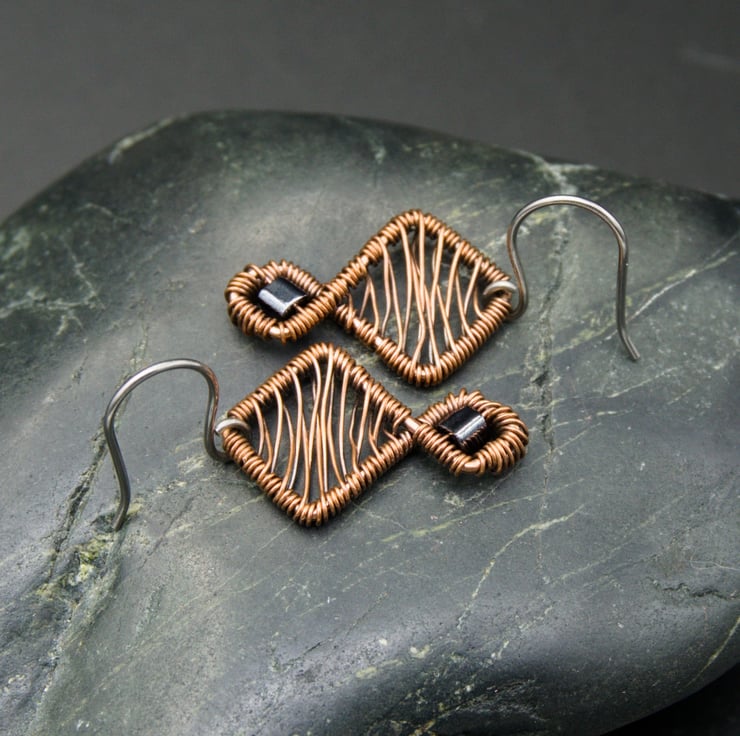 These unusual geometric earrings have been made by forming copper wire into a double diamond shape, & then weaving very fine wire through the top diamond using a ladder weave. I've then added a 3mm cubed glass bead into the bottom diamond - the beads are a dark grey metallic colour.