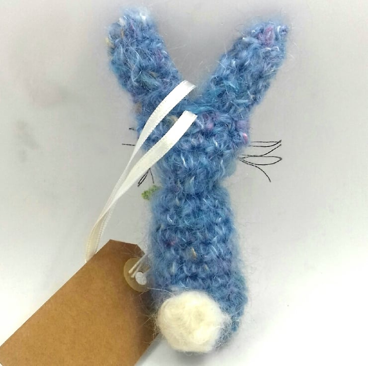 The rabbit measures approximately 12 cm tall and has a narrow satin ribbon as a hanging loop.