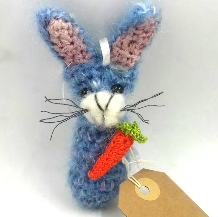 The fluffy bunny on this hanger is all ready to deliver a message on your behalf. The rabbit is crocheted in a mohair blend and lightly filled with polyester stuffing. It has glass beads for eyes and is carrying a little cotton carrot as a gift. The tag reads ' Hoppy Easter!" although I am very happy to exchange this tag for one with a message of your choice.