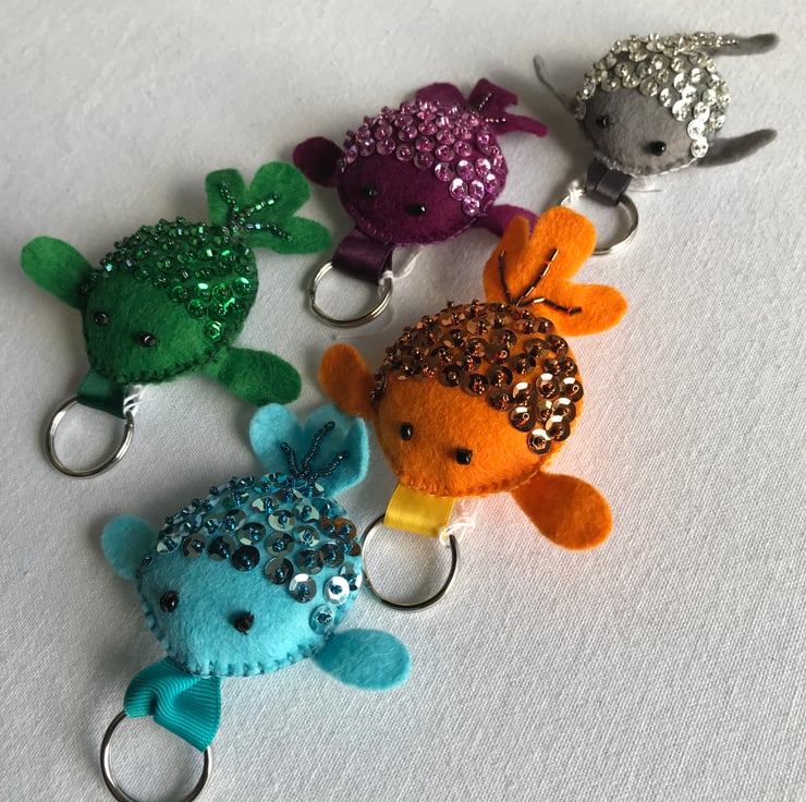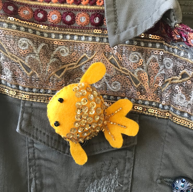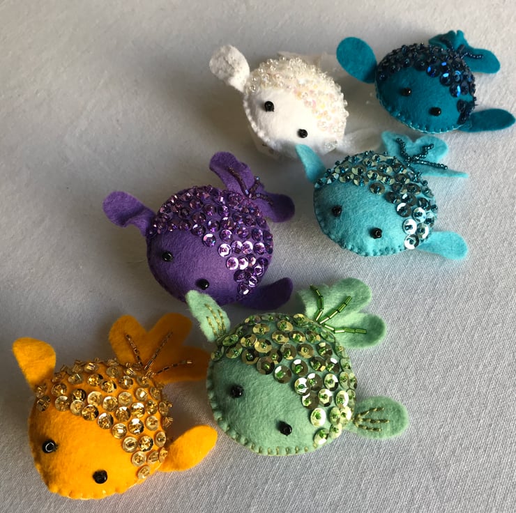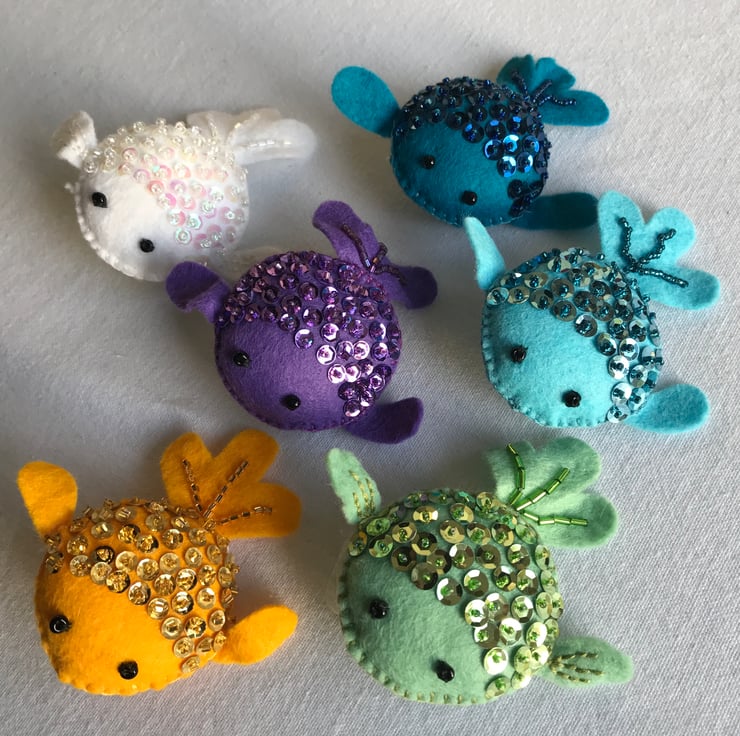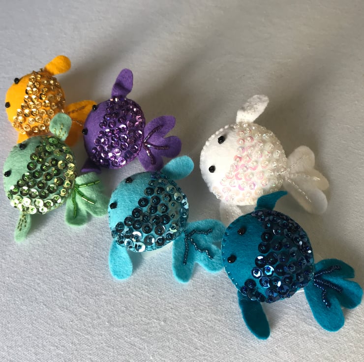 Fun and funky, these little fish brooches are made from felt with sequin scales that sparkle in the light. They measure approximately 8.5cm from head to tail.