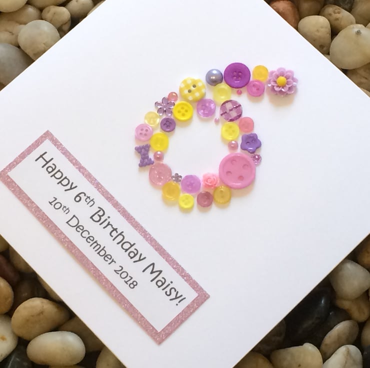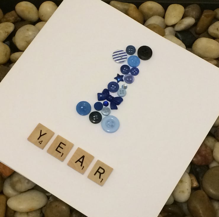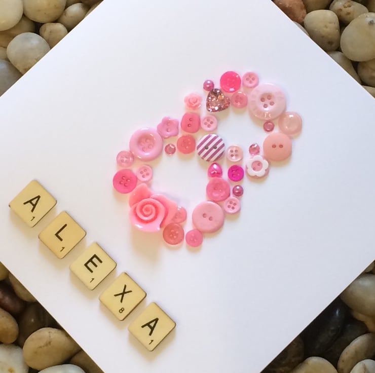 A stunning, simple and stylish 1st birthday card in gorgeous pink shades of buttons and embellishments with wooden scrabble tiles. The card is 8" x 8" and is blank inside for your own message. A card that is guaranteed to be a real talking point and be treasured forever by that very special friend or relative. It is your choice which colour combinations you would like, making it even more personable.
