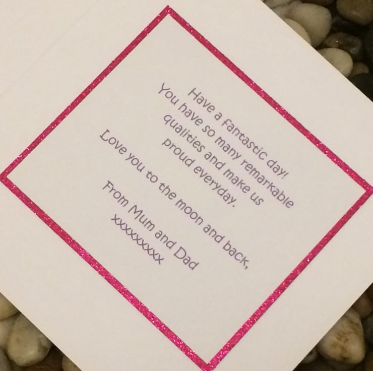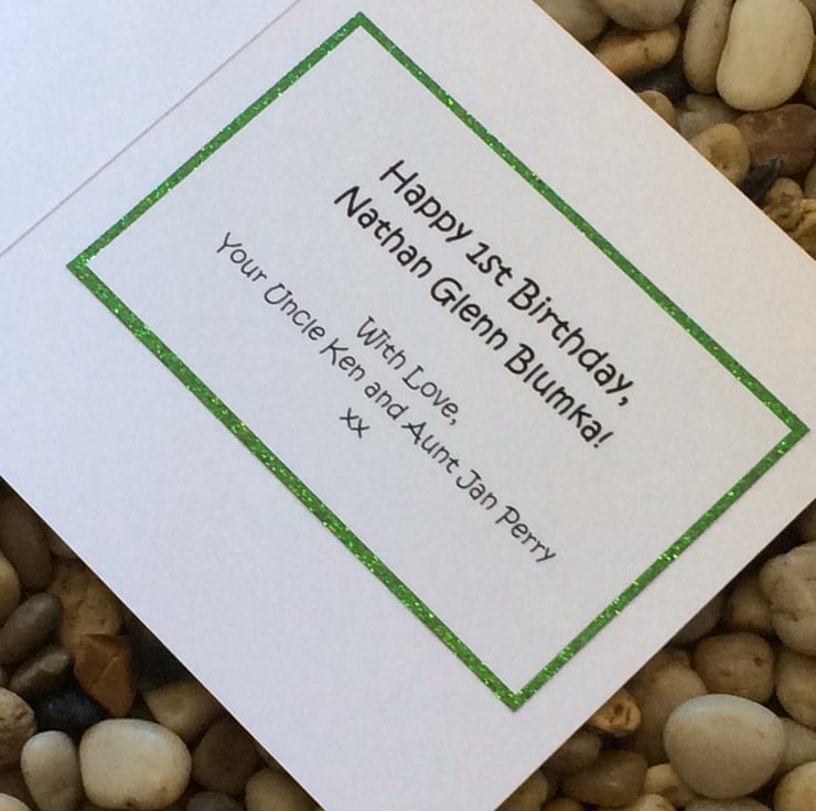 Label on card front: A label of your choice is added to the front of the card, printed on white card and then backed on non-shed glitter card. It is attached to the card using foam pads, giving it an extra special 3d touch. This card is left blank inside for your own message.
