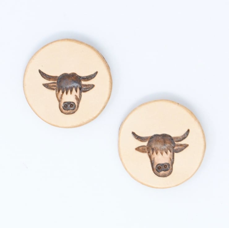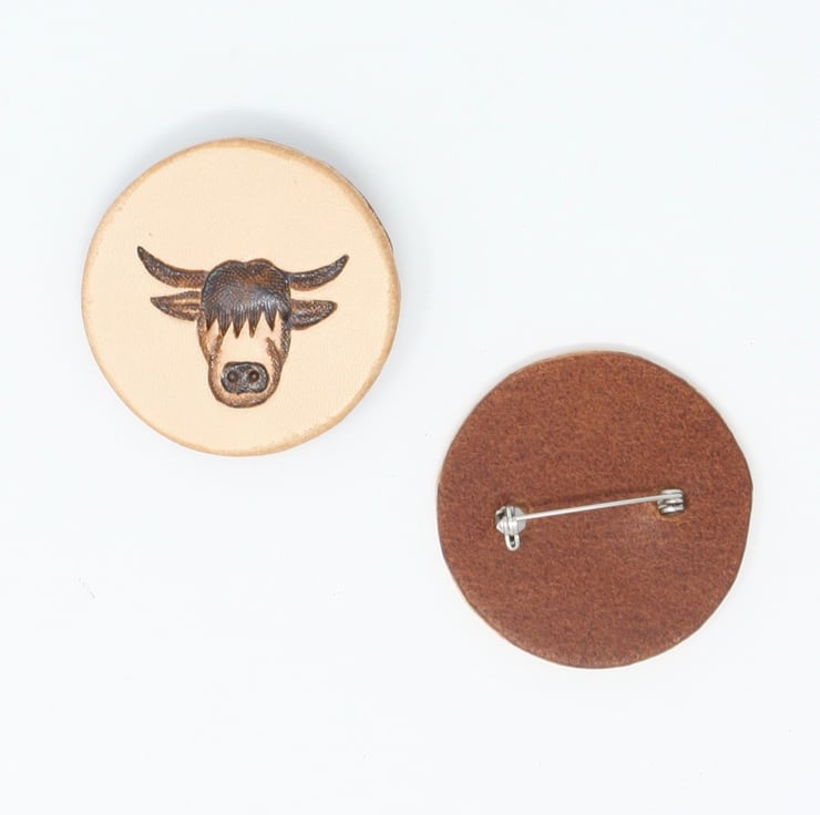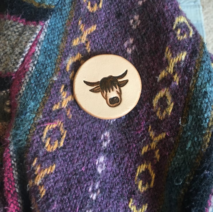 This hand-painted 'highland coo' is made from embossed tooling leather. The image is drawn on to the leather and then embossed using special detail stamps. The image is then painted with leather dye to accentuate the cow's features. The brooch measures approximately 45mm and has a safety clasp fastening on the back.