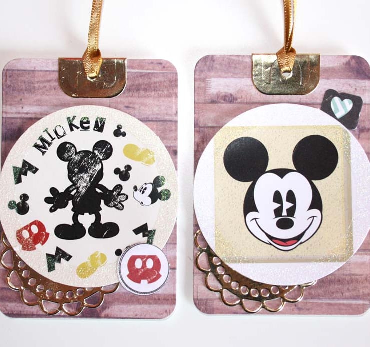This tag set comprises 5 Mickey Mouse theme gift tags. Each tag features gold die cut card, Mickey Mouse graphics and gold ribbon.