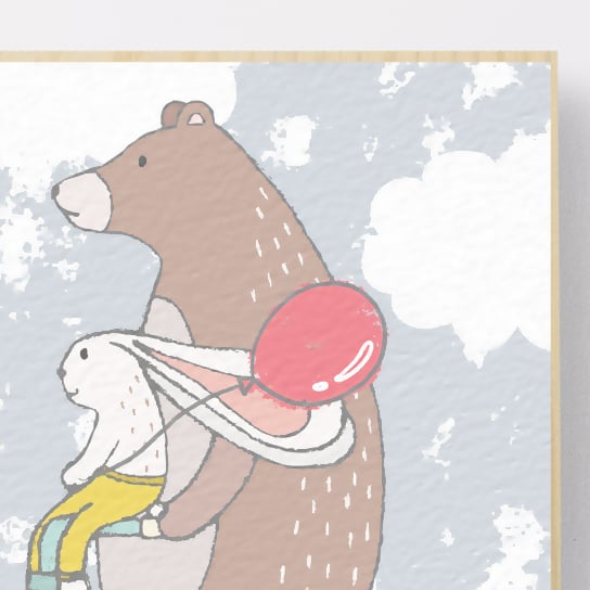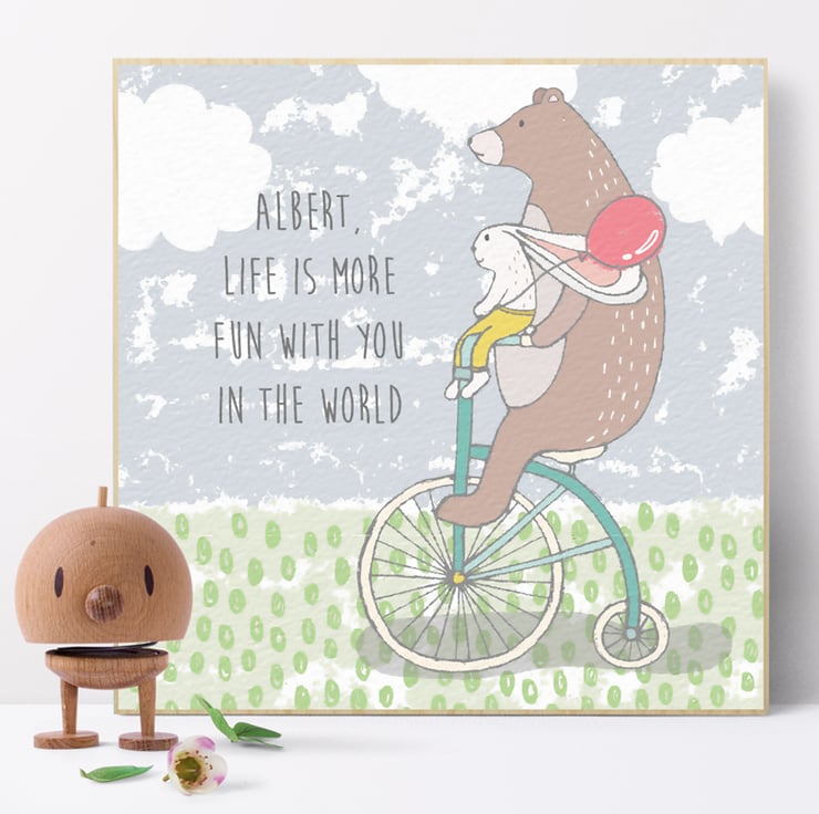 Personalised to order with any name or title. Featuring a bike riding bear and his little rabbit friend, it will be loved by all ages: baby to adult. This lovely chunky picture block is freestanding and made from solid hand cut pine wood, finely sanded for a beautifully smooth finish.