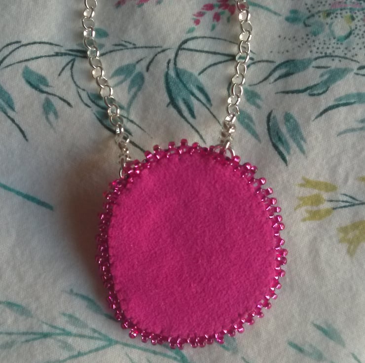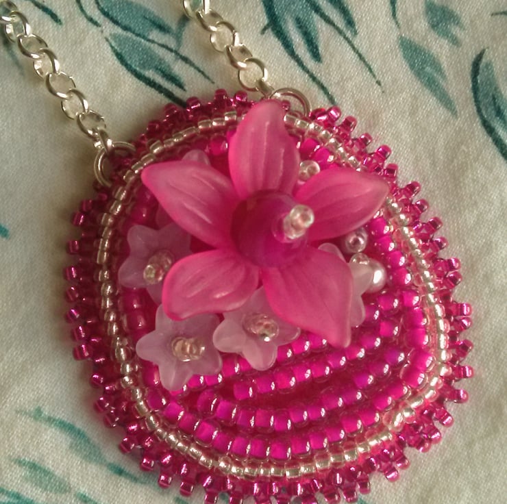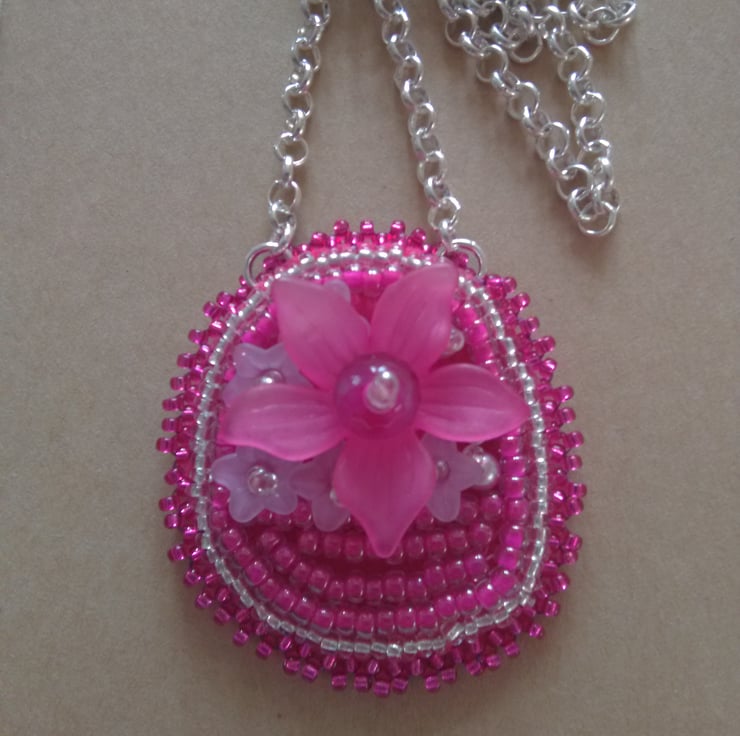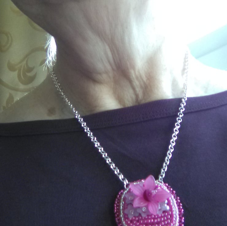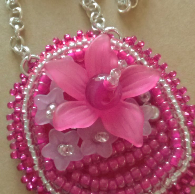 A profusion of pink and lilac lucite flowers spills out of a beaded basket. All hand embroidered using miyuki seed beads, some glass pearls and a beautiful dyed agate bead in the centre of the largest flower. This piece is backed with fuchsia coloured ultrasuede so it feels soft against your skin. Suspended from a silver plated round link chain with an extension chain so you can vary the length, and fastened with a silver plated lobster clasp.