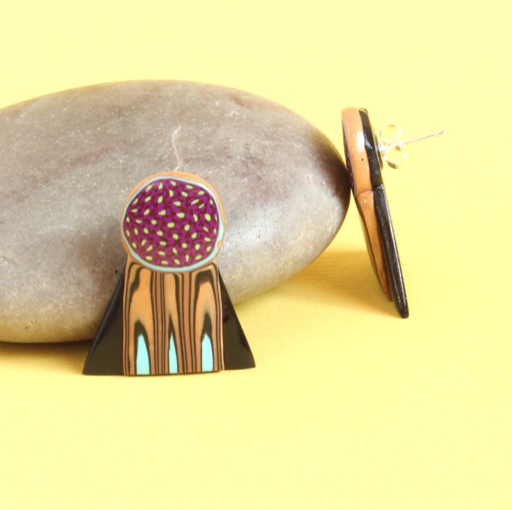 Hand crafted to my own unique and original design they are made from polymer clay and will keep their fine colours and pattern forever. They are highly polished and comfortably lightweight to wear. The pins and clips fitted are of top quality sterling silver.