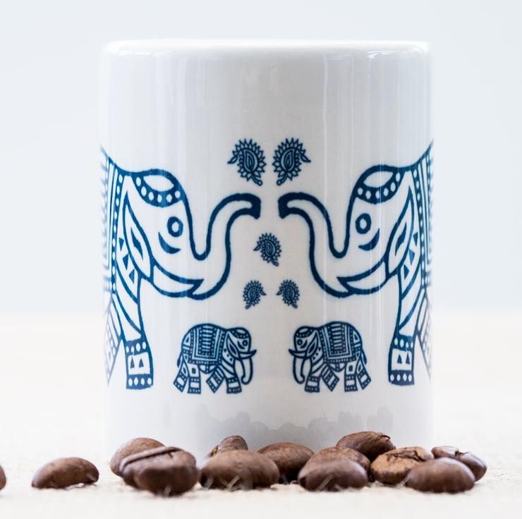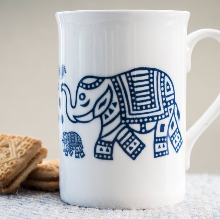 Inspired by the traditional Indian craft of woodblock printing, this mug uses a wood block design to create a unique and beautiful mug depicting a family of Indian elephants. The midnight blue contrasting with the bright, glossy white bone china or ceramic will fit into many a kitchen decor and crockery collection.