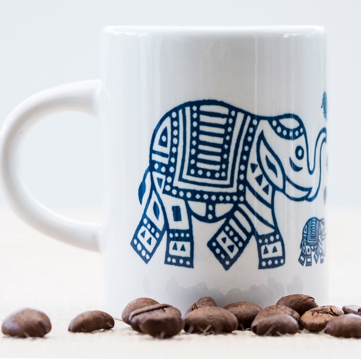 Bone China Coffee Mug and Ceramic Espresso with Indian inspired Elephant design.