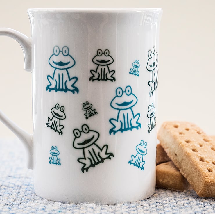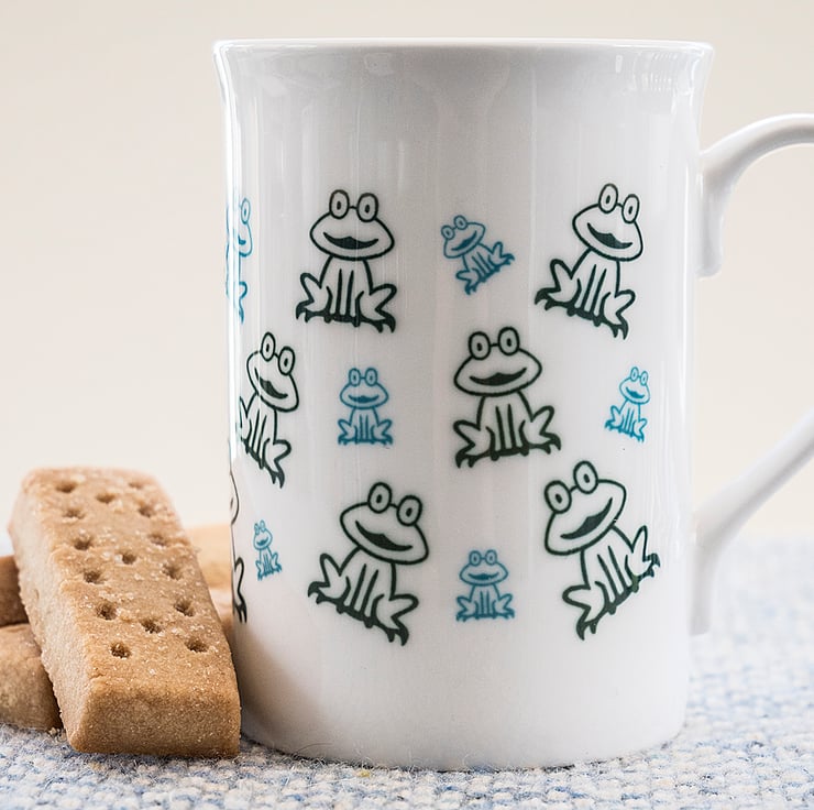 Inspired by traditional Indian woodblock print designs this unique bone china coffee mug will bring a smile to anyone's face. The humorous cartoon-like frogs in dark green and teal are grinning away to greet you as you reach for that much-needed coffee!