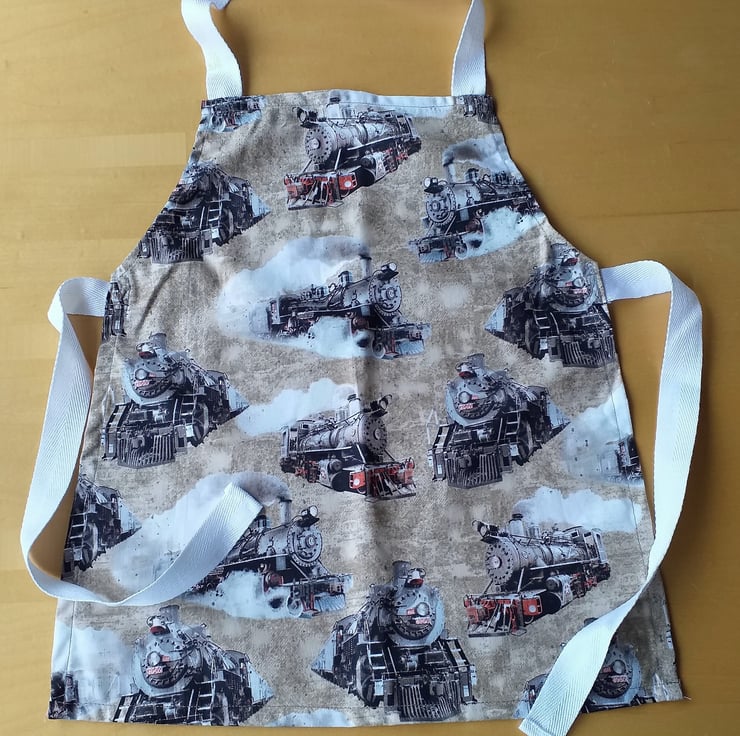This is a lovely tan child's pinny with sepia American-style steam engines all over it. (The engines may not appear in the same positions as in the illustration.) I have made it of a good quality machine washable cotton, with acrylic webbing straps. It measures approximately 17" (43 cms.)from neck to hem, and 14" (36 cms.) at the widest point, and will fit a child from about 2-6 years. The child demonstrating a different apron in the photo is three years old.