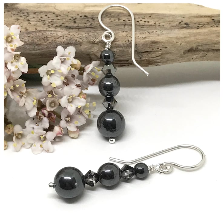 I have selected hematite beads in graduating sizes 8mm, 6mm and 4mm and 4mm sparkling crystals in ‘silver night’ I have threaded these beautiful beads onto sterling silver and attached them to handcrafted sterling silver earwires.