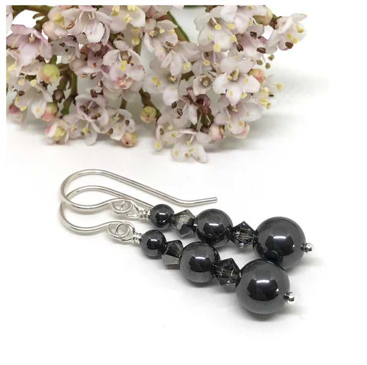 A stunning combination of graduated polished hematite beads and sparkling crystals from Swarovski®. A unique pair of sterling silver drop earrings.