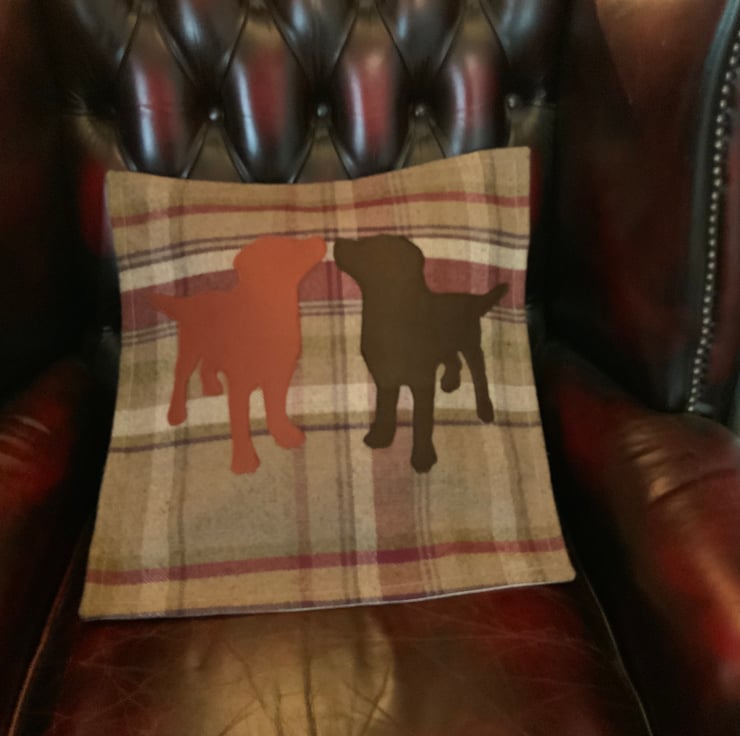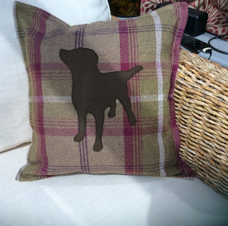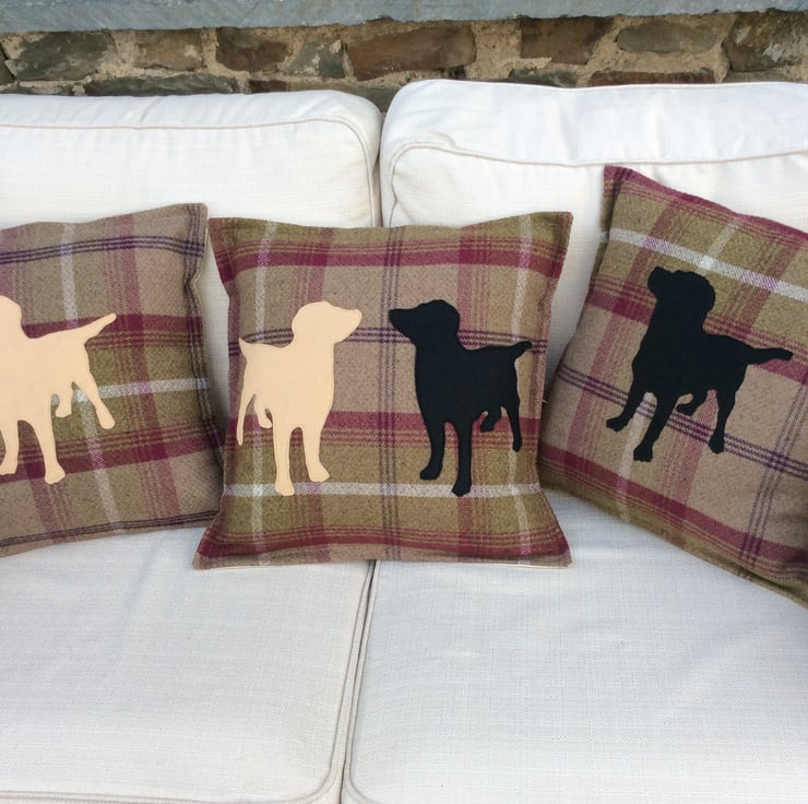 A lovely Heather wool check cushion cover with a Black, Chocolate, Yellow or Fox Red Labrador Appliqué can be made or a combination of colours.