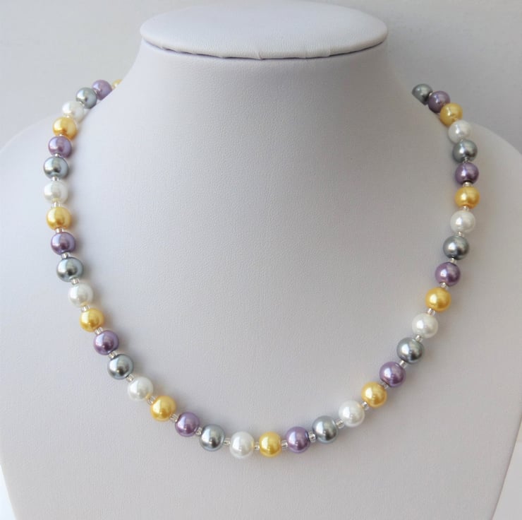 Necklace made using 8mm purple, yellow, silver and white glass pearl beads and silver lined seed beads.