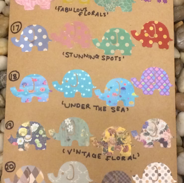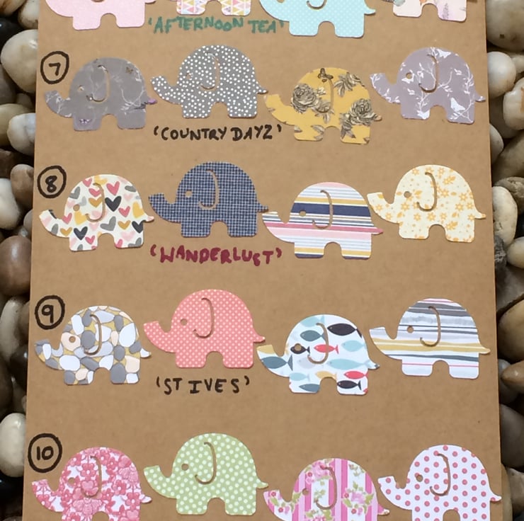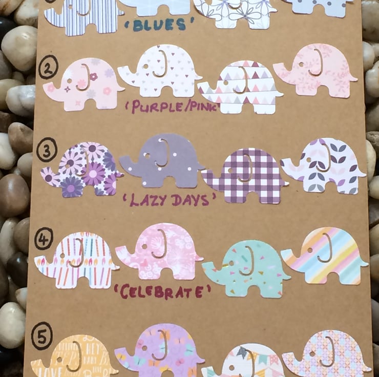The adorable elephant is carefully hand punched from pretty patterned and coloured card - the above design is number 1, 'Blues'. It is then attached to the card using small foam pads, giving it an extra special 3d appearance. The button balloon is then carefully chosen to co-ordinate and attached. If you would like another pattern of card, please look through the pictures above - just let me know when ordering.