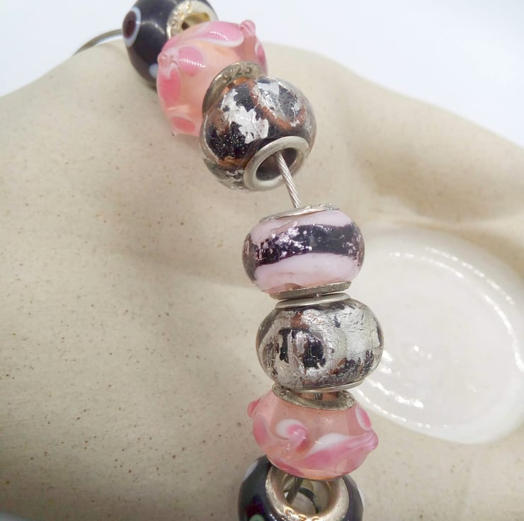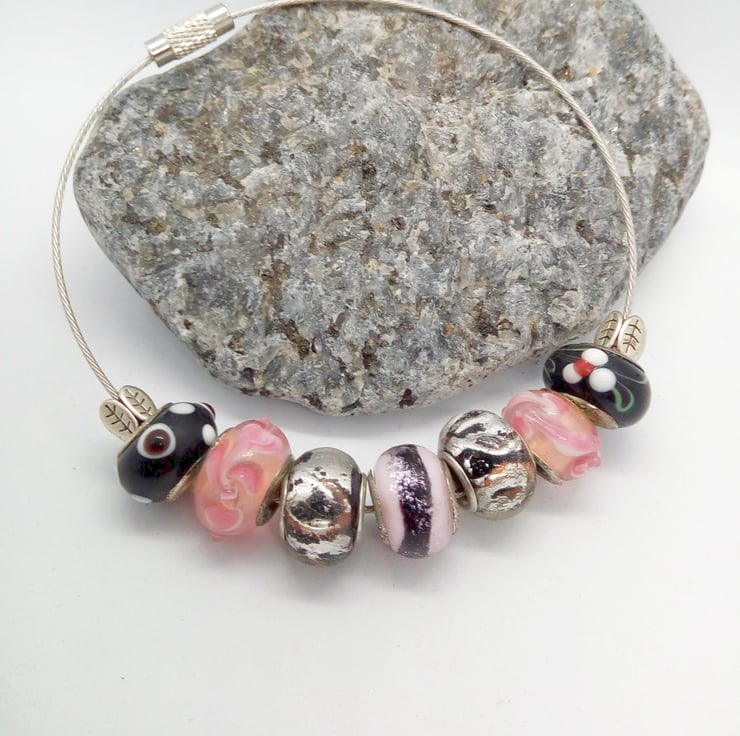 Pink and Black European Lampwork Bead Bracelet on a Memory Wire Band, Jewellery, Gift, Birthday, Christmas, Accessories, Gift for Friend