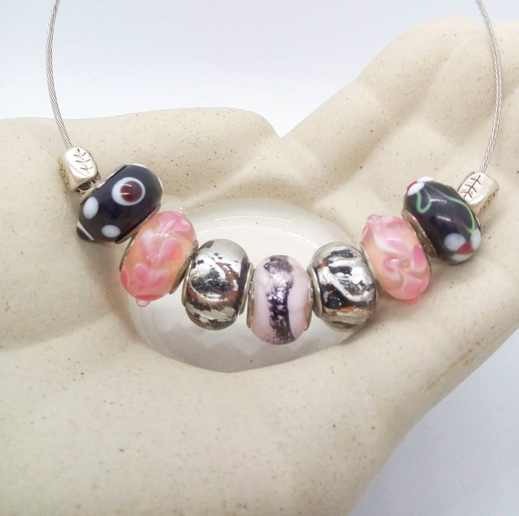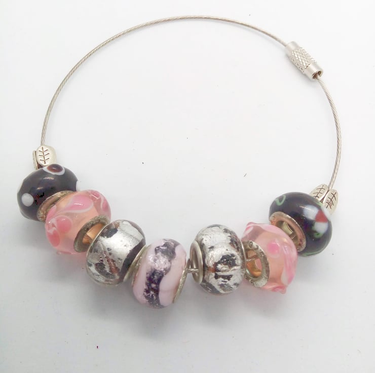The bracelet is made using 12mm Lampwork Glass Beads in pink and black, on a gray covered memory Wire Bracelet. Bracelet is 19.5cm in circumference and has a silver plated lobster clasp.