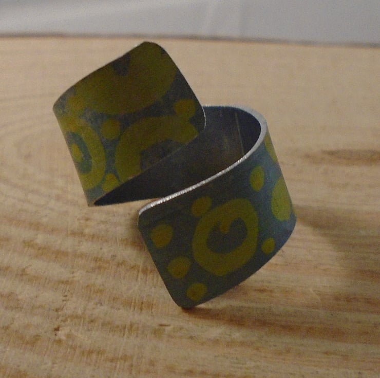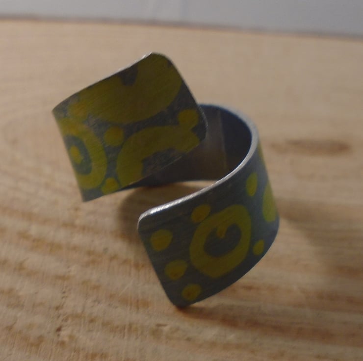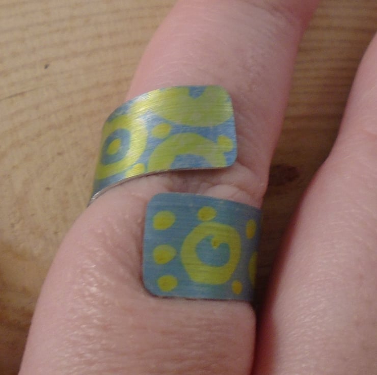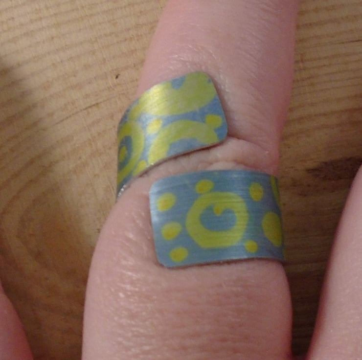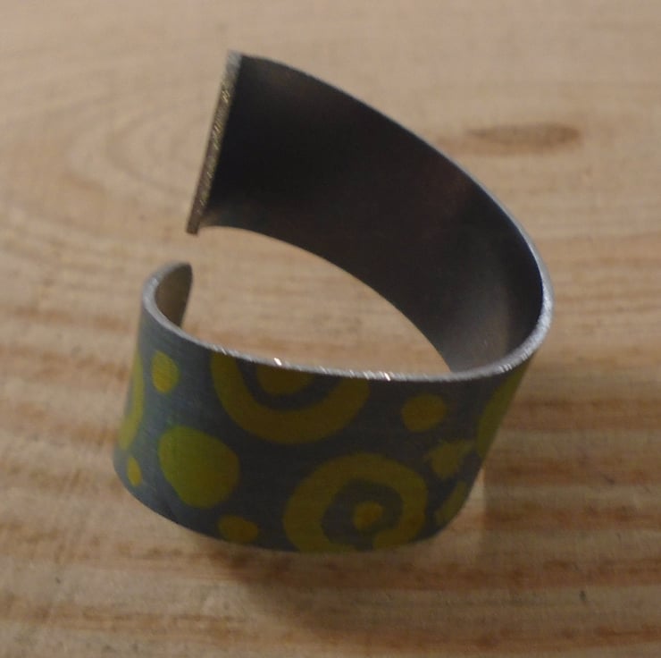 A simple and quirky ring, hand made from anodised aluminium. A 1cm wide strip of aluminium has been hand cut. It has then been hand drawn with yellow circled and dots, and then dipped in black dye.