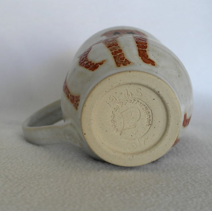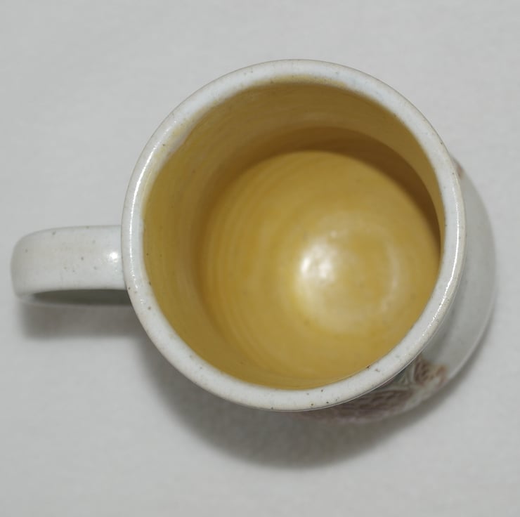 This mug was thrown by Annette on a pottery wheel with decoration inspired by her drawings for adult colouring books. From this drawing two adhesive stencils were made, one for each side of the mug. The stencils were eased into place onto the curve of the pot and three coats of glaze painted carefully into the outlines. The mug was given a light blue satin glaze painted inside and on the outside around the images. Once the glaze was dry the stencil was removed to leave an unglazed outline, which when kiln-fired leaves the image outlined in the colour of the vitrified clay.